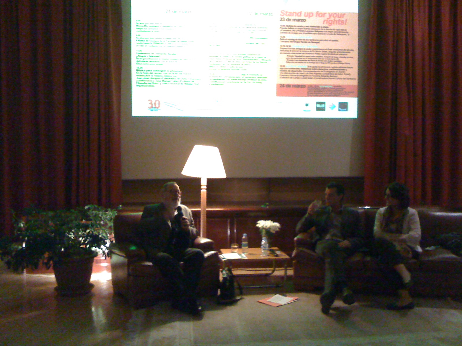 La conferencia (esto no fue sorpresa) resultó una delicia. En otra de hace muchos años Savater definió al intelectual (creo que citando a Jefferson) como aquel que trata a los demás como si fueran intelectuales. Y allí pasamos todos nuestra horita, contentos de ser intelectuales como Savater. Una pausa de civilización y finura. Defendió la alegría, que está sujeta al tiempo y que pasa, pero que cuando ocurre lo hace de verdad; va con fecha y en esa fecha nunca dejará de ser alegría, de haberlo sido. La felicidad, sin embargo, nunca se cumple: es una proyección a la que, en realidad, le sobra la vida; anhela el resguardo del trasmundo. (La felicidad vino a ser la mala de la conferencia.) La alegría no espera, no le pone requisitos a la vida: vive a posta, vive deliberadamente. No es una aceptación pánfila sino trágica: la del amor fati de Nietzsche. Yo anoté en mi cuaderno esta divisa: "alegre e infeliz". Salieron más nombres, todos introducidos con elegancia, con suavidad: Herzen, Wittgenstein, Séneca, Borges, Kafka, Santayana, Aristóteles, el Sócrates del Fedón... De Herzen contó lo que una viejecita le dijo una vez que él se quejaba del mal tiempo: "mejor que haga mal tiempo a que no haga ninguno". De Santayana leyó un texto sobre la "risa en defensa propia". En consonancia, añadió Savater que la risa aligera el peso de la vida, y que alegría viene de ahí: de aligerar. "Más importante que el valor es el humor", dijo, "porque el valor es no tenerle miedo a la muerte y el humor es no tenerle miedo a la vida". Se refería al humor irónico, no al sarcástico: "El sarcasmo rechaza, la ironía acoge". El coloquio, como he dicho, fue estupendo. Se mencionó a Singer, a Hannah Arendt. Una alumna quiso saber si la ética podía terminar con la crisis, a lo que respondió jocosamente Savater: "Si no puede Zapatero, ¿cómo va a poder la ética?". Otra, antes de preguntar, dijo que era "un honor" dirigirle la palabra. Cuando se dio por concluido el acto, ya a las dos y media, los aplausos duraron más de lo normal. Resultó perceptible. Savater, que iba a levantarse del sillón donde lo habían puesto, tuvo que permanecer sentado unos segundos. Fue el procedimiento que encontramos para darle calor a la gastada rutina de aplaudir.
