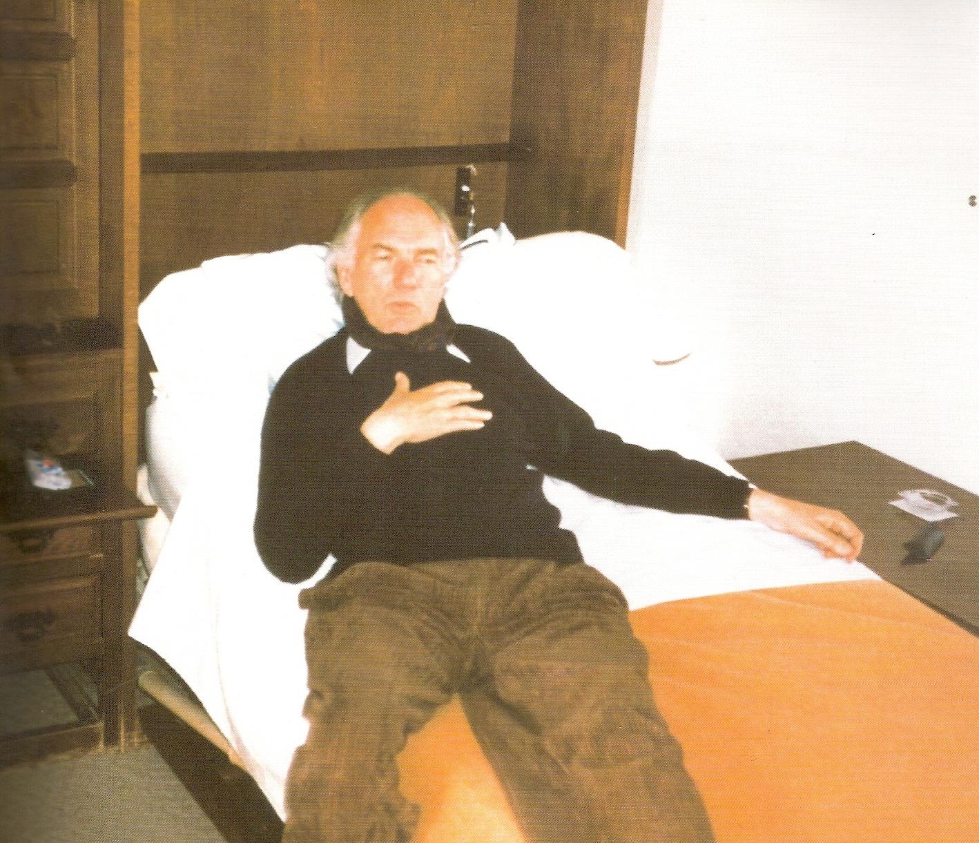 En una aparece postrado en la cama de su habitación del hotel, vestido, con un pañuelo al cuello y con una mano en el pecho, como un poeta romántico, aunque sin queja.