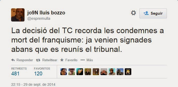 También en los años ochenta estaban todo el tiempo en la televisión y de gira por España las compañías catalanas de teatro. Por Málaga pasaban con frecuencia Els Comediants, Els Joglars, La Fura dels Baus, Dagoll Dagom... Ahora uno de esta última compañía, el individuo Joan Lluís Bozzo, ha evacuado en Twitter, a propósito de la suspensión cautelar del referéndum secesionista por parte del Tribunal Constitucional: "La decisió del TC recorda les codemnes a mort del franquisme: ja venien signades abans que es reunis el tribunal". Esto era un país que se estaba civilizando pero que contenía brutos que lo embrutecían.
